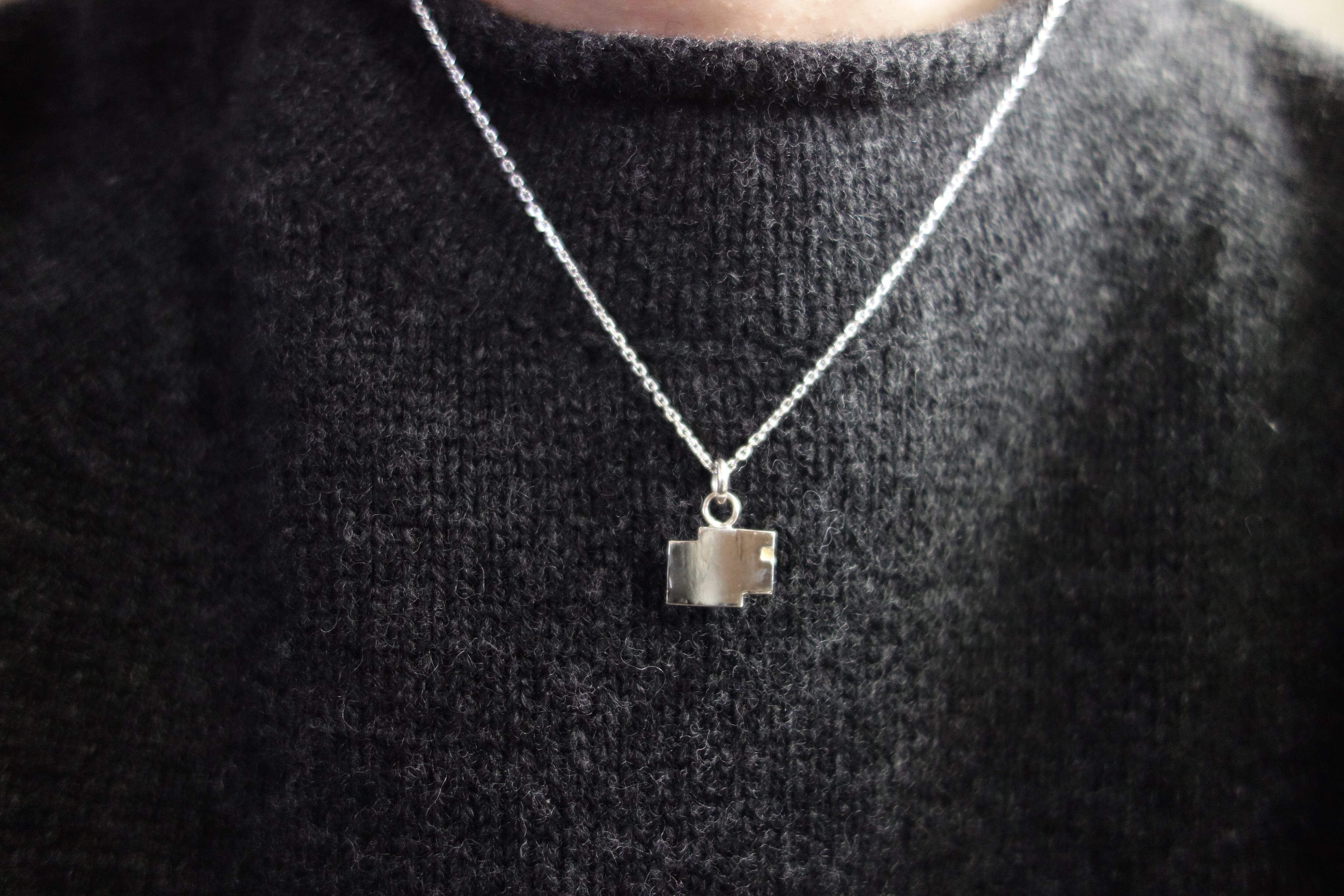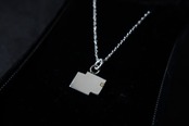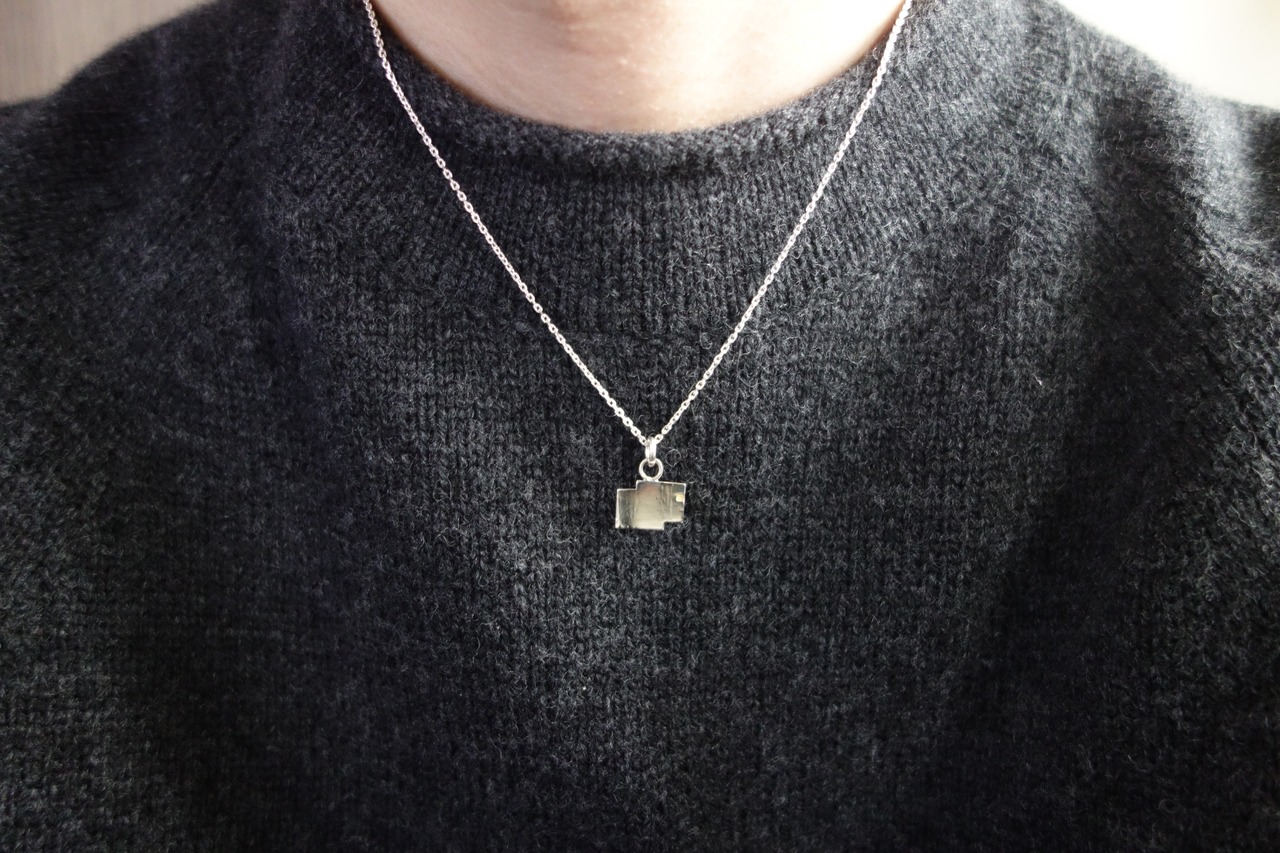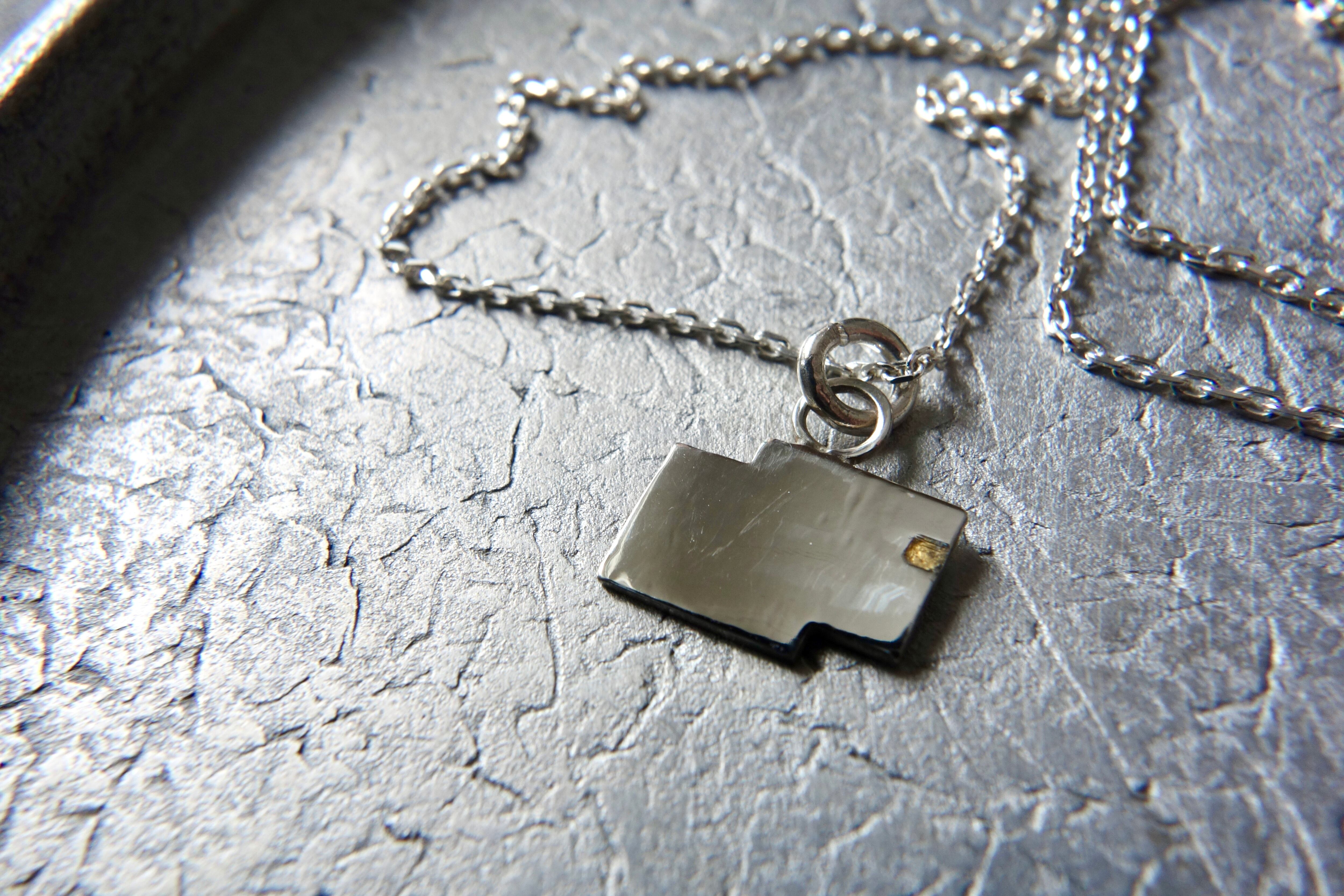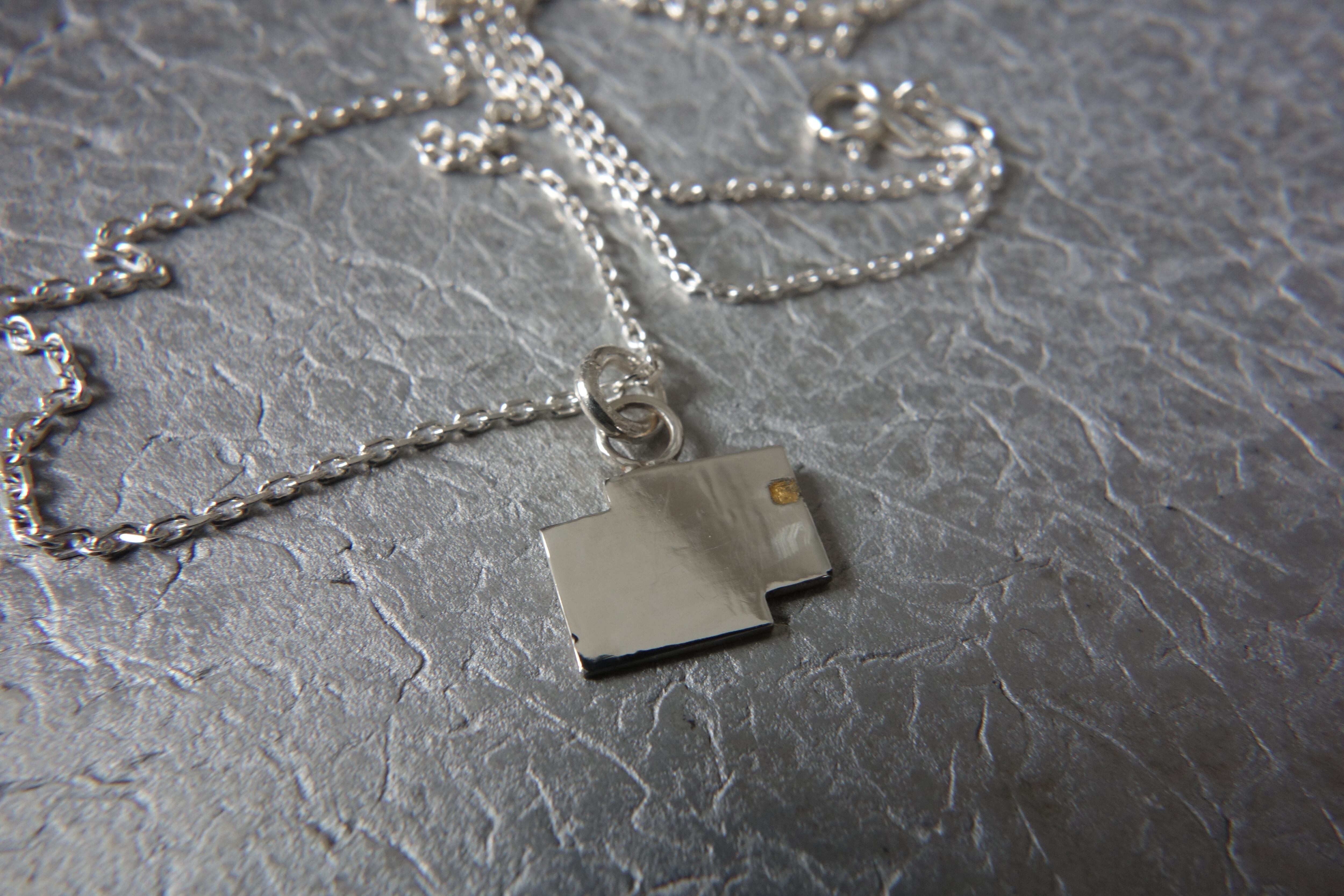 一か月表示のカレンダーの形をモチーフにシルバーのプレートを切り出し、日付の位置に金箔をあしらったペンダントです。