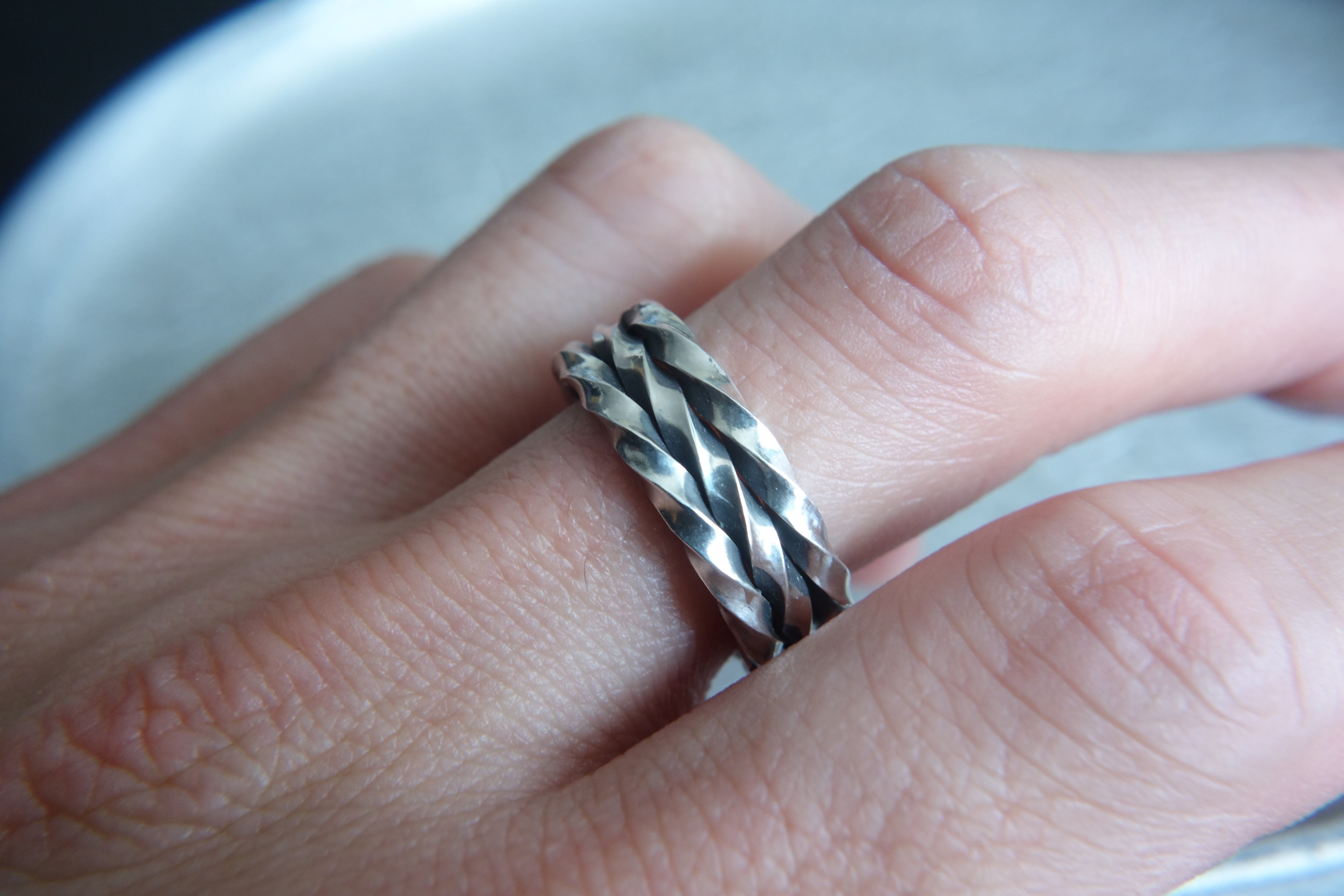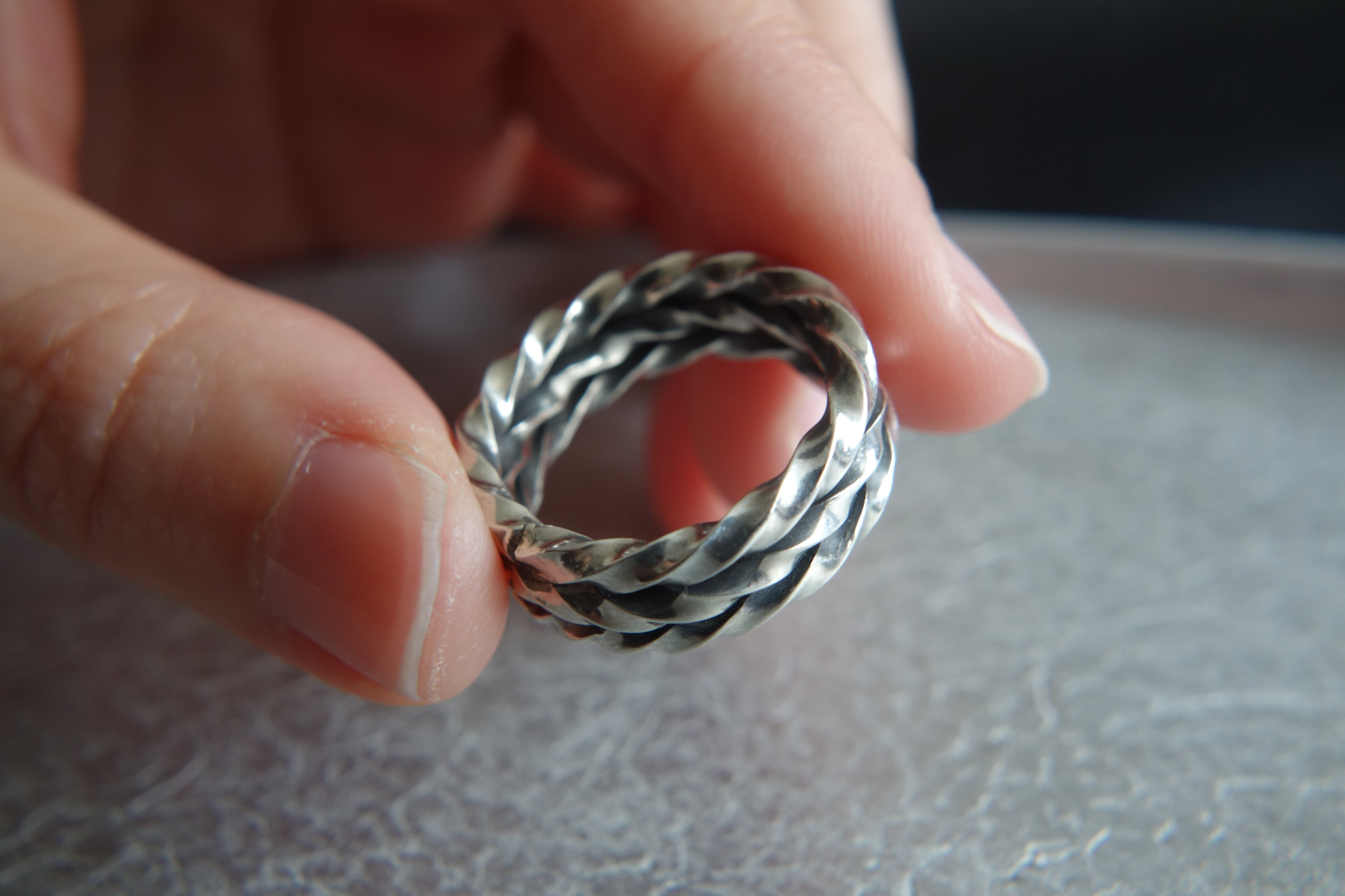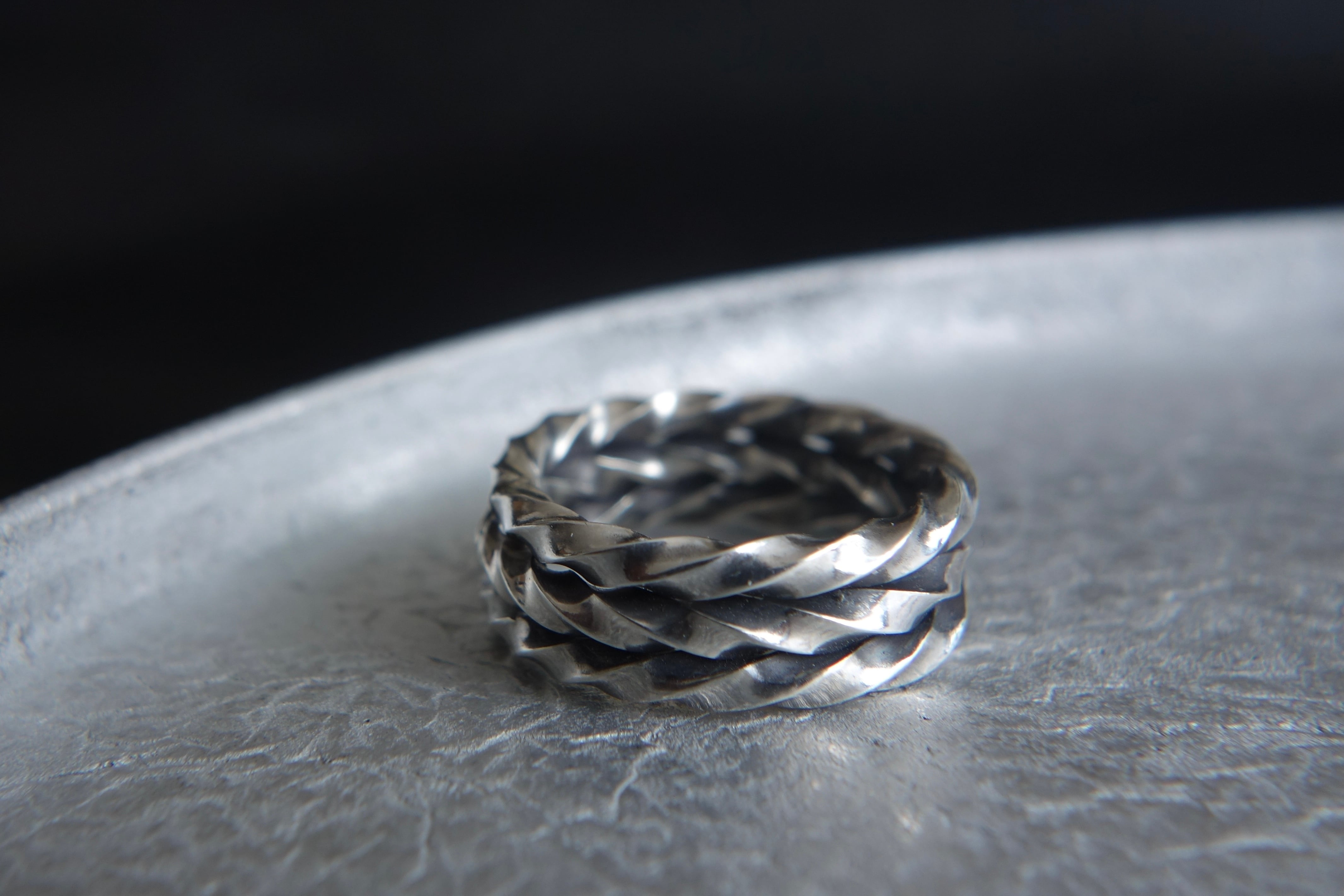 シルバー925の角銀線をねじって螺旋状にしたものを三連にしたリングです。