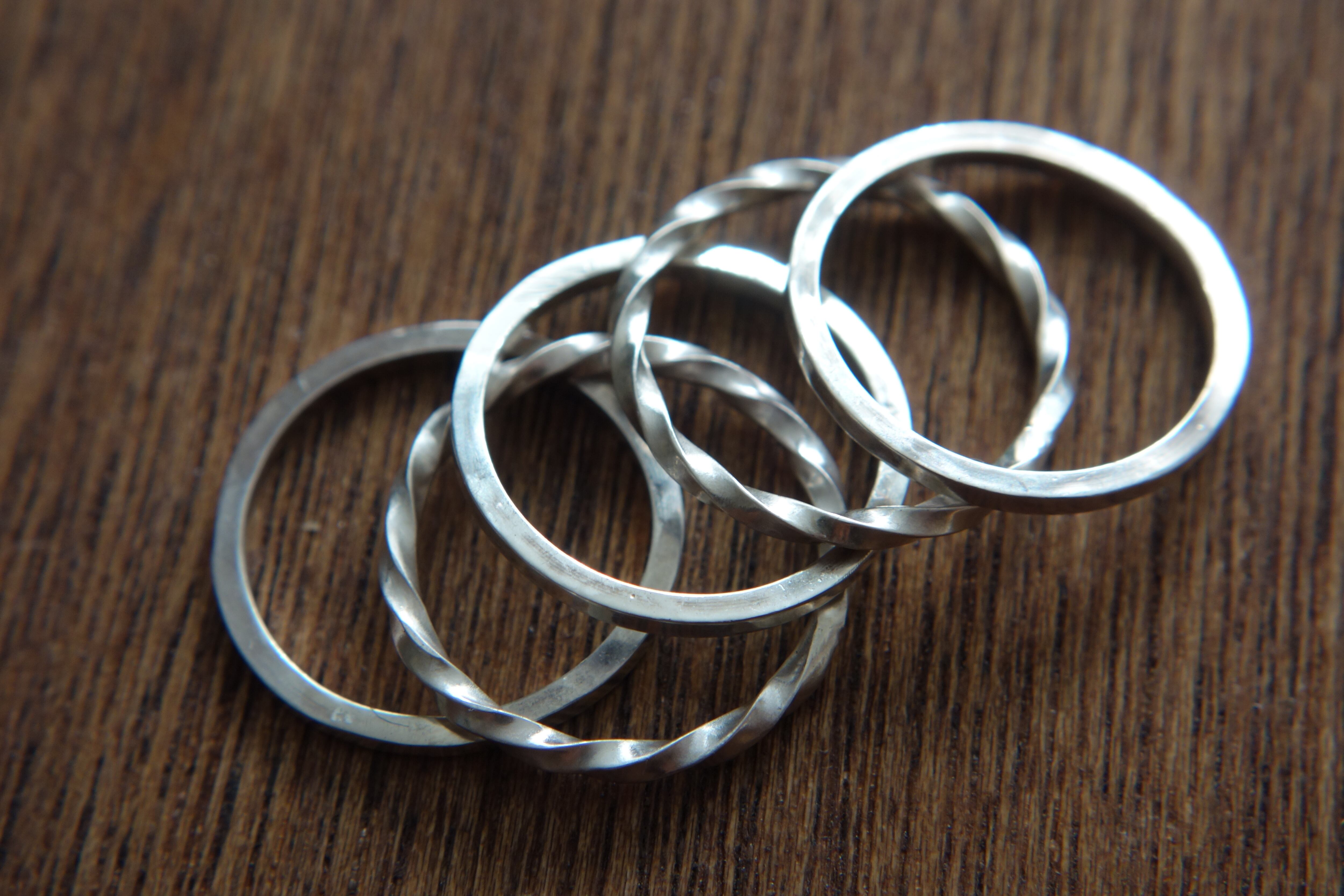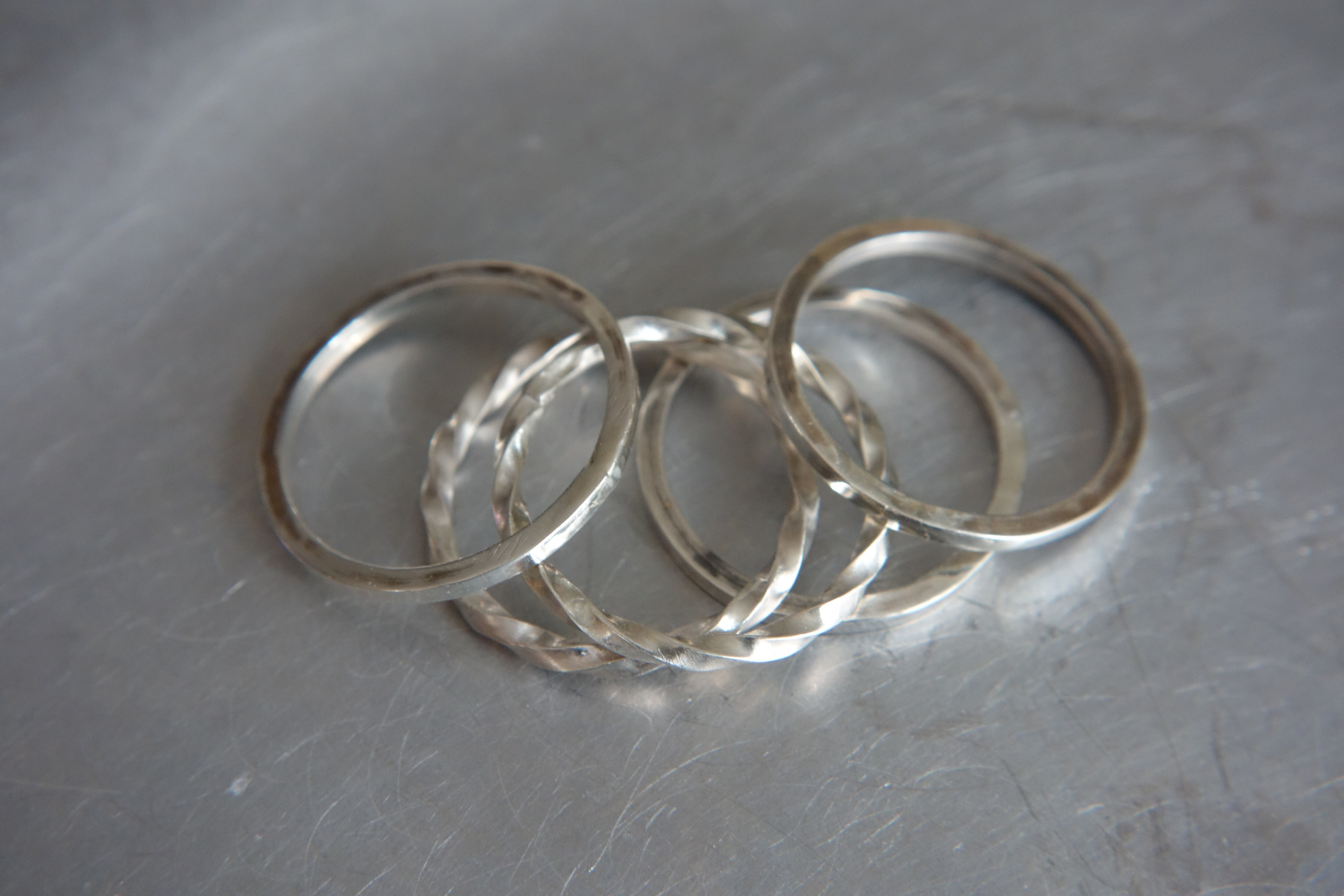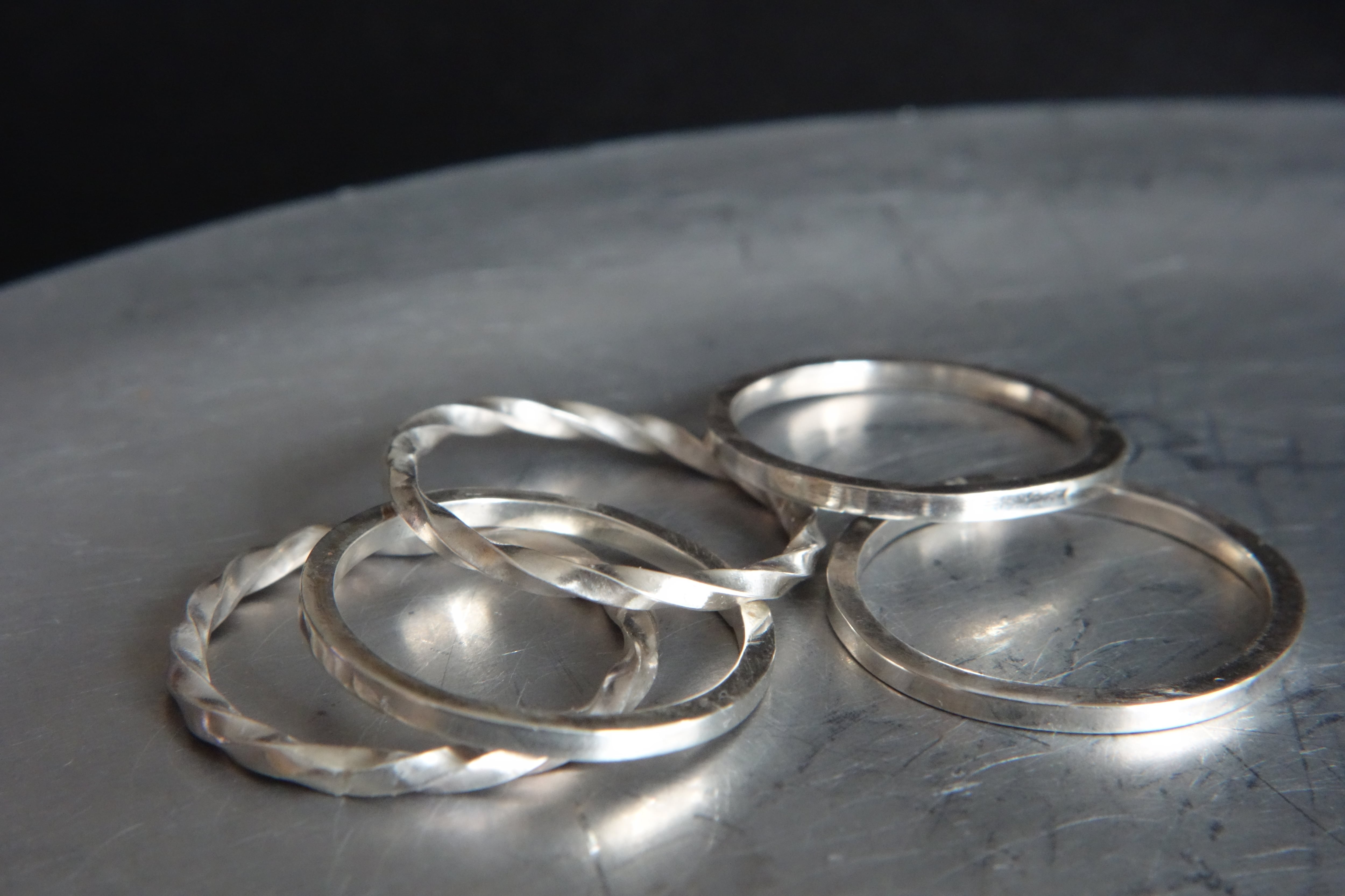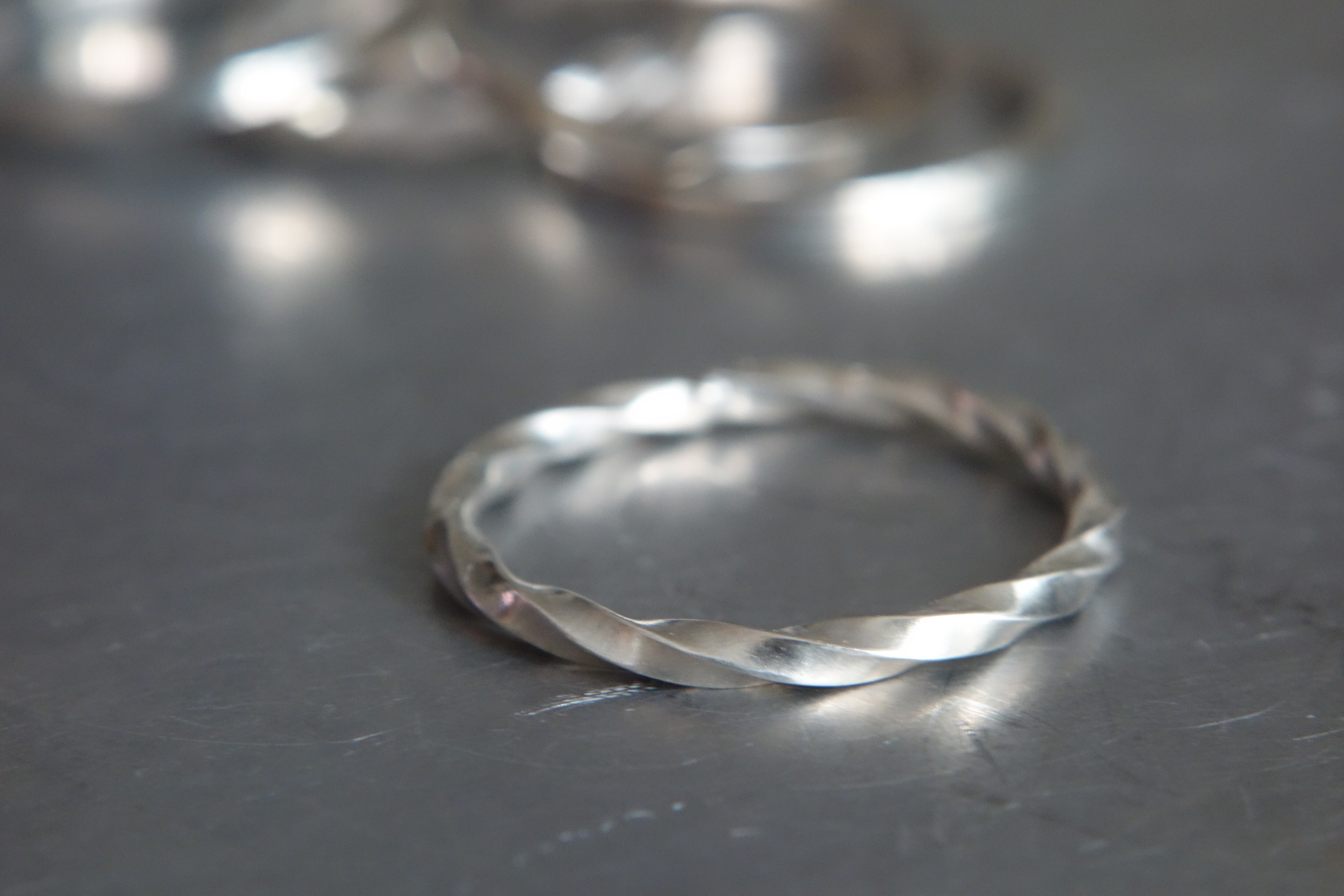 シルバー925製の角銀線を普通に丸めたタイプ(Simple)とひねりを加えて丸めたタイプ(Twist)、二種類の表情の異なるリングの組み合わせを楽しめるリングです。
